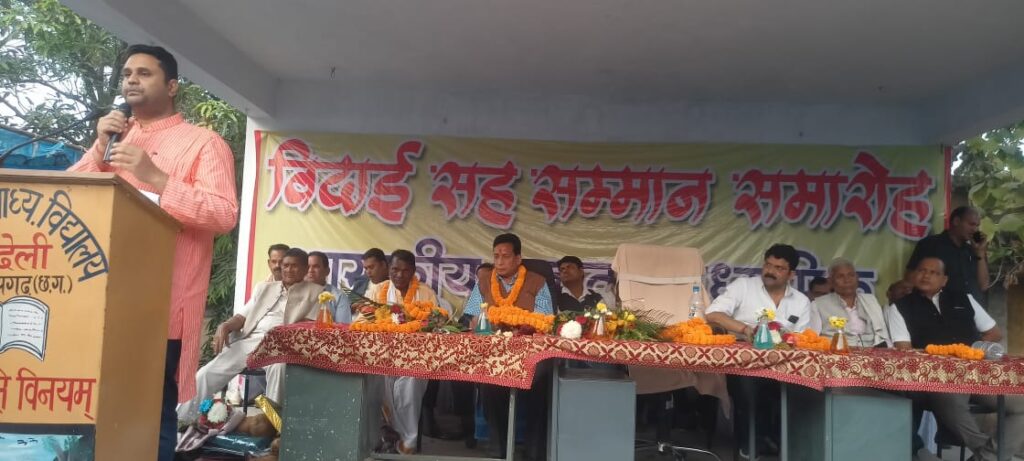 सेवानिवृत्त प्रधान पाठक अरविंद कुमार पटेल के सम्मान समारोह के अवसर पर मुख्य अतिथि उमेश नंदकुमार पटेल ने अपना उद्बोधन मे कहा कि किसी भी व्यक्ति के लिए उसकी उपलब्धि का मापदंड उसके शिष्यों की सफलता और मुकाम हासिल करने पर निर्भर करता है । हम गौरवशाली हैं कि हमारे ग्राम के विद्यालय में पदस्थ शिक्षक बड़े गुरुजी के नाम से पहचाने जाने वाले स्व. हेमचरण पटेल और उनके पुत्र