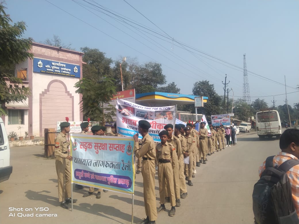 रायगढ़ । आज दिनांक 05.12.2022 को एनएसएस और एनसीसी कैडेट्स द्वारा संयुक्त रूप से शहर में यातायात जागरूकता रैली निकाल कर शहरवासियों को यातायात जागरूकता वाले बैनर, पोस्टर, स्लोगन और पर्चे वितरण कर सड़क दुर्घटना से बचाव के नियमों का पालन करने प्रेरित किया गया । आज सुबह यातायात थाने के सामने कैडेट यातायात नियमों का पालन करने की शपथ लेकर यातायात पुलिसकर्मियों के साथ शहर में रैली निकाले जो गौशाला, हंडी चौक, सुभाष चौक, गांधी प्रतिमा के बाद एसपी आफिस पहुंचा । उसके बाद कैडेट्स शहर के अलग-अलग यातायात पाइंट पर पहुंचे, जहां यातायात पुलिसकर्मी के साथ राहगीरों को सदैव सड़क के बाई ओर चलने एवं दुपहिया वाहन चालकों को हेलमेट पहनने, तेज गति से वाहन ना चलाने और वाहन चलाते समय मोबाइल का उपयोग नहीं करने की समझाइश दिए । यातायात पॉइंट पर कैडेट्स को यातायात पुलिसकर्मियों द्वारा सड़क सुरक्षा के महत्वपूर्ण नियमों को बताया गया और संकेतों के बारे में जानकारी देकर उनसे अभ्यास कराया गया । यातायात डीएसपी श्री दीपक मिश्रा बताये कि प्रशिक्षित एवं अनुशासित कैडेट्स को त्यौहार एवं विशेष कार्यक्रम के समय शहर में यातायात जवानों के साथ वॉलिंटियर के रूप में लिया जावेगा, पहले भी ऐसे अवसर पर कैडेट्स अपनी सहभागिता दर्ज कराएं हैं। यातायात जागरूकता रैली में कैडेट्स के बढ़ चढ़कर भाग लेने के लिये उनकी प्रशंसा किये ।