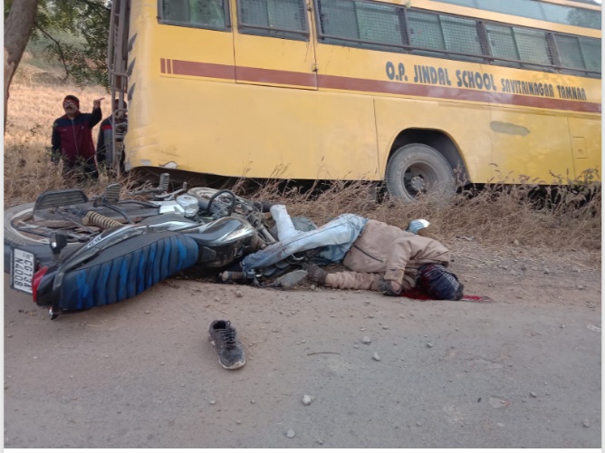 जिंदल की स्कूल बस बच्चों को लेकर तमनार के जिंदल स्कूल जा रही थी। वहीं सामने बाइक सवार तेज रफ्तार में था। दो पहिया वाहन सीधे जाकर बस में जा घुसी जिससे बाइक सवार युवक की मौके पर ही मौत हो गई।
