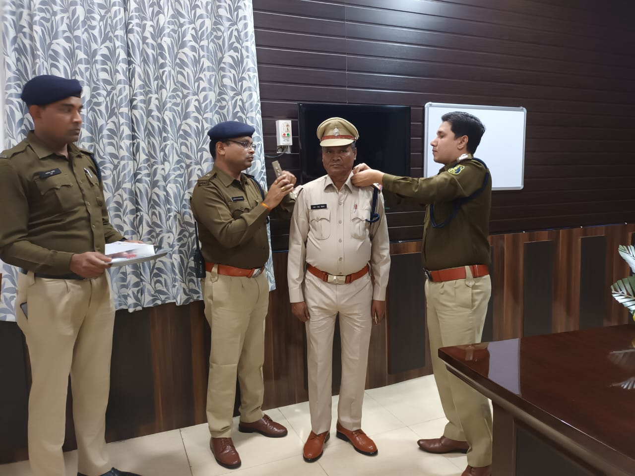 रायगढ़ । पुलिस महानिदेशक महोदय छत्तीसगढ़ द्वारा 29 दिसंबर 2022 को राज्य के 77 उपनिरीक्षकों को निरीक्षक के पद पर पदोन्नति आदेश जारी किया गया है । निरीक्षक के पद पर पदोन्नति प्राप्त करने वालों में जिले के जूटमिल में कार्यरत उपनिरीक्षक आर.एस. नेताम भी शामिल हैं । आज पुलिस कार्यालय रायगढ़ में पुलिस अधीक्षक श्री अभिषेक मीना एवं अतिरिक्त पुलिस अधीक्षक श्री संजय महादेवा द्वारा उपनिरीक्षक आर.एस. नेताम के कंधों पर स्टार लगाकर उन्हें निरीक्षक पद की शुभकामनाएं देते हुए पद की गरिमा अनुरूप जिम्मेदारी पूर्वक सौंपे गये कार्यों का निर्वहन कहा गया ।