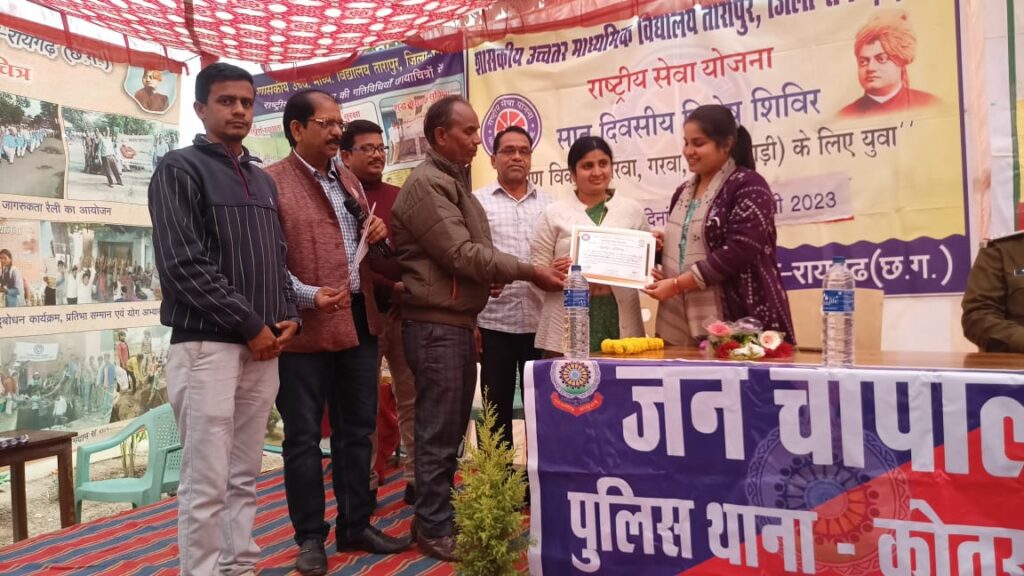 स्वयंसेवकों द्वारा प्रातः कालीन जागरण प्रभातफेरी निकालने के बाद योग एवं व्यायाम किया गया तत्पश्चात परियोजना कार्य के अंतर्गत ग्राम के मुख्य बस्ती में नालियों की सफाई कर श्रमदान किया एवं बौद्धिक परिचर्चा में रायगढ़ से पहुंची पुलिस विभाग के अधिकारी श्रीमती नीकिता तिवारी मिश्रा डीएसपी रायगढ़ एवं कोतरा रोड थाना प्रभारी गिरधारी साव अपने स्टाफ सदस्य आरक्षक द्वय हरीशंकर नायक एवं सुरेंद्र भगत के साथ पहुंचकर छात्र- छात्राओं को सड़क दुर्घटनाओं से बचने के उपायों पर जानकारी दी एवं पुलिस विभाग से संबंधित विभिन्न विषयों व कानून की भी जानकारी एनएसएस के स्वयंसेवकों को दी गई I शिविर स्थल में गुरुवार को रायगढ़ जिला के प्रतिष्ठित योग आचार्य एवं आयुर्वेद चिकित्सक डॉ. शशिभूषण नायक ने स्वयंसेवकों को योग के लाभ एवं इससे जीवन में स्वास्थ्य रक्षा की उपयोगिता को लेकर अपना प्रेरक मार्गदर्शन दिया डॉ.शशि भूषण नायक के साथ