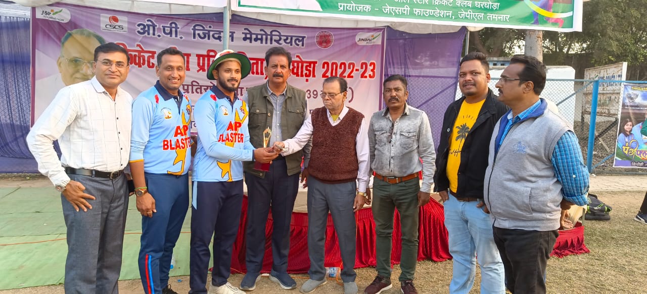 ओपी जिंदल मेमोरियल क्रिकेट लीग घरघोड़ा 2023 आज होगी ए पी ब्लास्टर एवं संस्कार स्काईज क़े मध्य फाइनल की द्वन्द