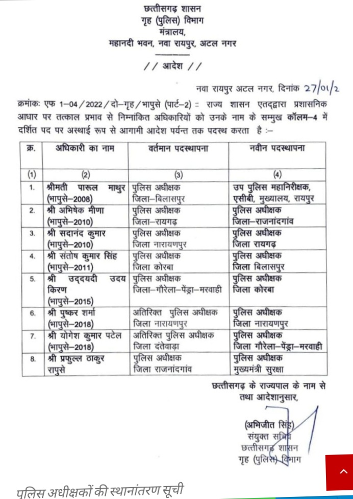 नियुक्त किया गया है। तो वही एसपी अभिषेक मीणा को राजनांदगांव की कमान संभालने को दी गई है।
