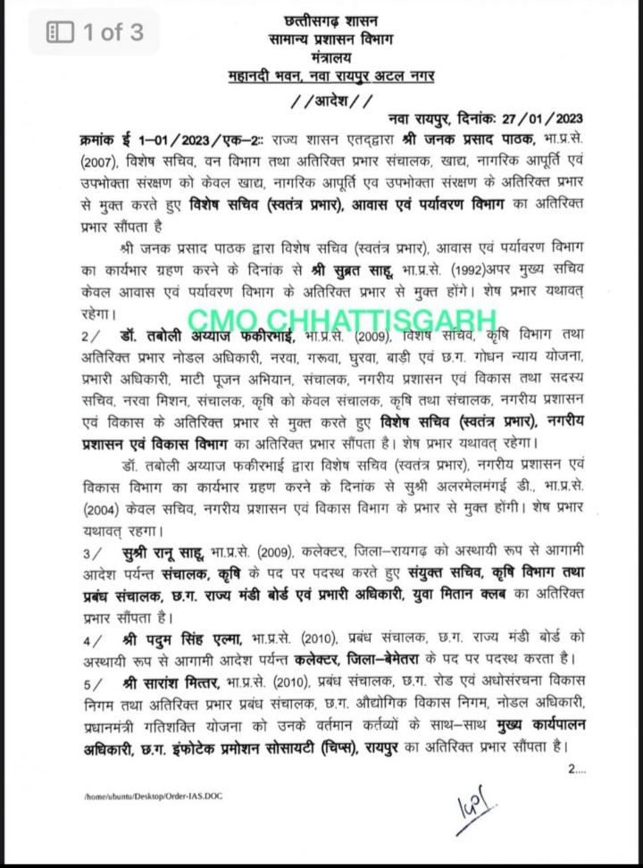 जहां कलेक्टर रानू साहू को संयुक्त सचिव कृषि विभाग प्रबंध संचालक छत्तीसगढ़ राज्य बोर्ड एवं प्रभारी अधिकारी के लिए