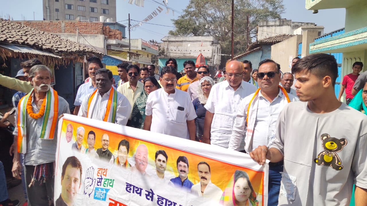 रायगढ़ जिला कांग्रेस कमेटी अध्यक्ष अनिल शुक्ला जी के निर्देशानुसार,ब्लाक कांग्रेस अध्यक्ष विकास ठेठवार के नेतृत्व में एवम महापौर जानकी अमृत काटजू के गरिमामयी उपस्थित में आज हाथ से हाथ जोडो यात्रा वार्ड क्रमांक 5 ढिमरापुर अभिनव स्कूल के पास से प्रारम्भ हुई।ढोल नगाड़े और गगनभेदी नारों के साथ यात्रा वार्डवासियों के बीच पहुंची जहां केंद्र सरकार द्वारा बढ़ती महंगाई ,किसानों के साथ हुए अत्याचार बेरोजगारी के मुद्दों के लेकर आक्रोशित लोगों के बीच जाकर उनके दर्द को समझा गया।महंगाई पर गीतों के माध्यम से मोदी सरकार तक वार्डवासियों की व्यथा पहुंचाने हेतु संजीदा पार्षद संजय चौहान ने अपने संगीत साथियों के साथ सुरीले व्यंग गीतों से चिंतनीय हास्य विनोद का वातावरण बनाया।