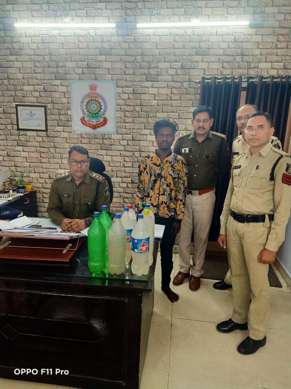 रायगढ़ । वरिष्ठ पुलिस अधीक्षक श्री सदानंद कुमार के दिशा निर्देशन तथा अतिरिक्त पुलिस अधीक्षक संजय महादेवा एवं नगर पुलिस अधीक्षक अभिनव उपाध्याय के मार्गदर्शन पर अवैध शराब पर कार्रवाई के क्रम में कल रात्रि थाना सिटी कोतवाली रायगढ़ की टीम द्वारा थाना प्रभारी कोतवाली निरीक्षक शनिप रात्रे के नेतृत्व में शहर के रियापारा में रहने वाले दीपक उरांव घर पर शराब बिक्री की सूचना पर शराब रेड कार्रवाई किया गया । थाना प्रभारी को सूचना मिली थी कि दीपक उरांव घर पर अवैध रूप से शराब बिक्री करता है । आरोपी के घर दबिश देकर उसे तलब कर पूछताछ करने पर आरोपी के पास से 8 नग 2-2 लीटर कोल्ड्रिंक की बॉटल में भरा हुआ *16 लीटर महुआ शराब, कीमती 4800 रूपये* बरामद हुआ । *आरोपी दीपक उरांव पिता धन सिंह उरांव 21 साल रियापारा थाना कोतवाली रायगढ़* पर थाना कोतवाली में धारा 34(2),59(क) आबकारी एक्ट की कार्रवाई कर रिमांड पर भेजा गया है । थाना प्रभारी कोतवाली निरीक्षक शनिप रात्रे, सहायक उप निरीक्षक सोहन साहू, राकेश शर्मा, प्रधान आरक्षक विक्रम चौरसिया, आरक्षक जगमोहन ओग्रे, उत्तम सारथी, प्रेम सिंह राठिया, महिला आरक्षक कस्तूरी राठिया शराब रेड कार्रवाई में शामिल थे ।