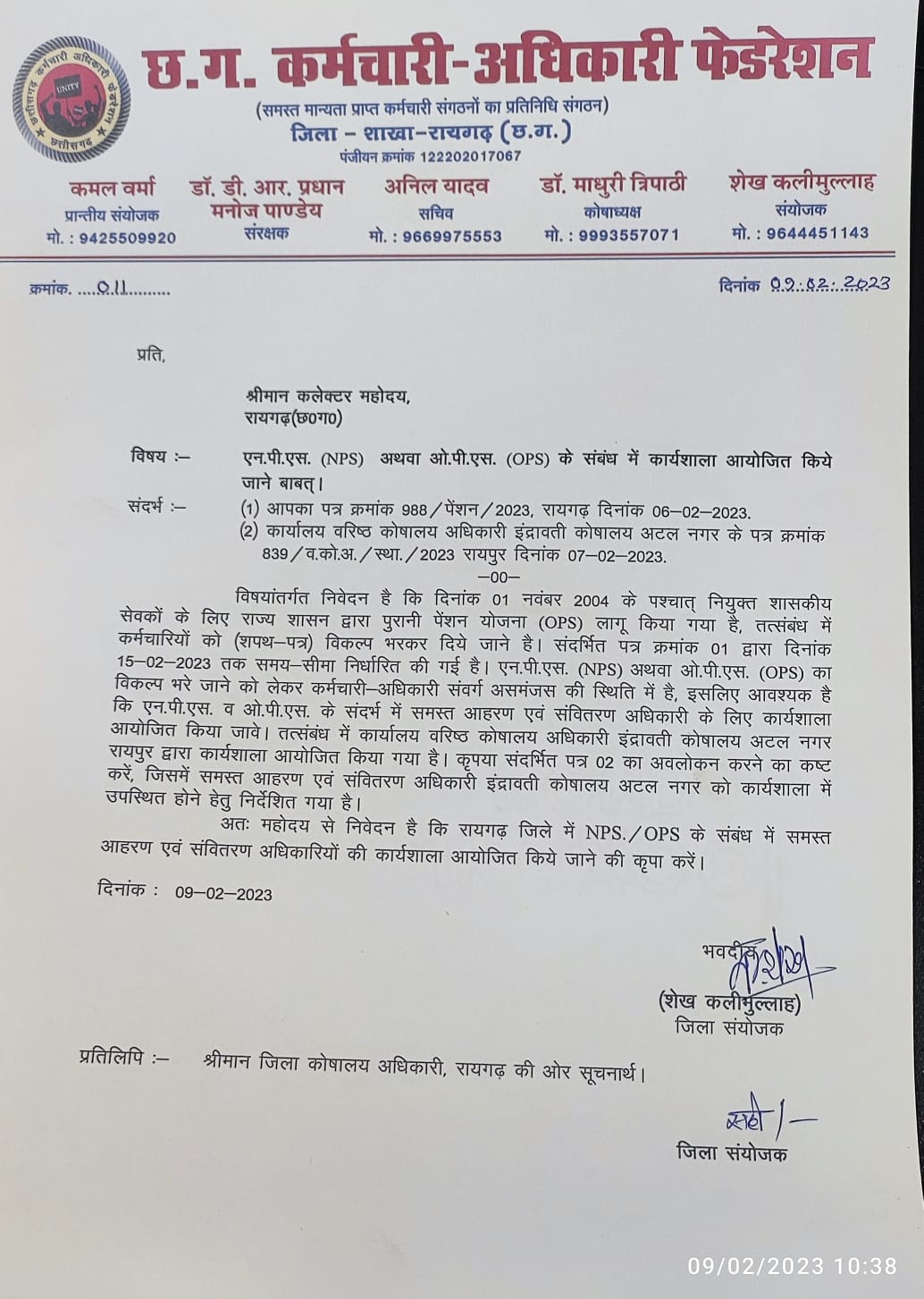 छत्तीसगढ़ कर्मचारी अधिकारी फेडरेशन के जिला संयोजक शेख कलीमुल्लाह सचिव अनिल यादव ने बताया कि राज्य शासन द्वारा 1 नवंबर 2004 के पश्चात नियुक्त कर्मचारियों के लिए पुरानी पेंशन योजना (ओ पी एस) लागू किया गया है तथा प्रचलित एनपीएस अथवा ओ पी एस का विकल्प चयन किए जाने के निर्देश दिए हैं। प्रदेश के कर्मचारियों एनपीएस ओ पी एस को लेकर असमंजस की स्थिति मे है। इस विकल्प का दूरगामी परिणाम होगा इसलिए कर्मचारी सतर्कता पूर्वक विकल्प का चयन करना चाहते हैं। यही वजह है कि छत्तीसगढ़ कर्मचारी अधिकारी फेडरेशन जिला शाखा रायगढ़ का प्रतिनिधिमंडल रायगढ़ कलेक्टर श्री तारन प्रकाश सिन्हा से मिला और एनपीएस और ओपीएस. पर कार्यशाला करने के की मांग रखी कलेक्टर रायगढ़ द्वारा त्वरित कार्रवाई करते हुए जिला कोषालय अधिकारी को कार्यशाला आयोजित करने के निर्देश दिए। निर्देश का पालन करते हुए जिला कोषालय अधिकारी द्वारा दिनांक 10,02,2023 को 11:00 सृजन कक्ष में जिले के सभी आहरण संवितरण अधिकारी को कार्यशाला में संबंधित लिपिक के साथ आहुत किया गया है। जिले के कर्मचारियों के एनपीएस ओ पी एस विकल्प पर कार्यशाला आयोजित करने के लिए छत्तीसगढ़ कर्मचारी अधिकारी फेडरेशन के जिला संयोजक शेख कलीमुल्लाह संरक्षक डॉक्टर डीआर प्रधान मनोज पांडे सचिव अनिल यादव कोषाध्यक्ष डॉ माधुरी त्रिपाठी सहसंयोजक गोविंद परधान रवि गुप्ता भागवत कश्यप महामंत्री धर्मेंद्र बेस विष्णु यादव प्रवक्ता आशीष रंगारी, के अलावा रति दास महंत राजेश तिवारी सुधीर पंडा लक्ष्मीकांत पटेल भुनेश्वर पटेल राजकमल पटेल पीसी साहू राम कुमार चौहान श्याम सिदार कमल सिदार सीपी डनसेना राजेश मेहरा सत्येंद्र मेहर सूरज खर्रा डिकाराम शेश संजीव सेठी वेद प्रकाश अजगले श्रीमती जानकी यादव श्रीमती मीना यादव आदि कर्मचारी नेताओं ने कलेक्टर रायगढ़ श्री तारन प्रकाश सिन्हा को साधुवाद दिया है और उम्मीद जताया है की कार्यशाला में ऐन पी एस ओ पी एस के सभी पहलुओं पर चर्चा की जाएगी और सही विकल्प चुनने का मार्ग प्रशस्त होगा। उक्त जानकारी प्रवक्ता आशीष रंगारी द्वारा दिया गया।