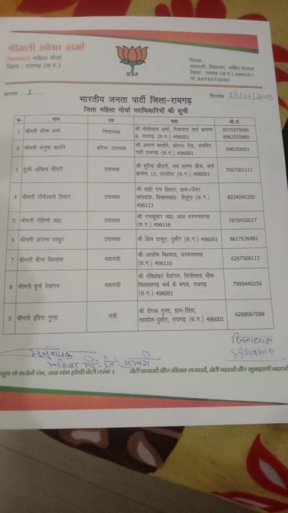 श्रीमती चंपा माली को कार्यालय मंत्री और श्रीमती निशा शुक्ला को सह कार्यालय मंत्री वही श्रीमती अंजू शर्मा को नारी शक्ति संयोजक एवम रीना दास महंत को नारी शक्ति सह संयोजक बनाया गया ,वही श्रीमती सरिता राजेंद्र ठाकुर को मीडिया प्रभारी ,श्रीमती सरिता चौहान को सह मीडिया प्रभारी बनाया गया,वही श्रीमती राधा पटेल को सोशल मीडिया प्रभारी एवम श्रीमती कुमारी साहिस को सोशल मीडिया सह प्रभारी बनाया गया !