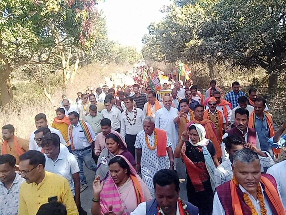 सात किलोमीटर की पदयात्रा कर सैकड़ों कार्यकर्ता और हितग्राही पहुंचे विधायक लालजीत राठिया के निवास का घेराव करने,