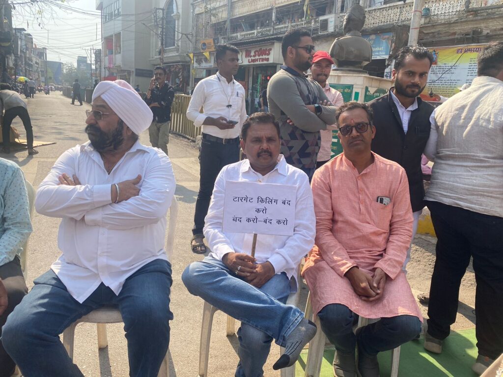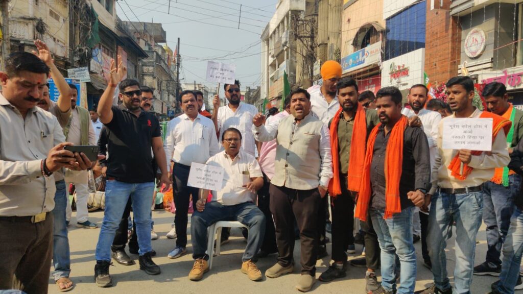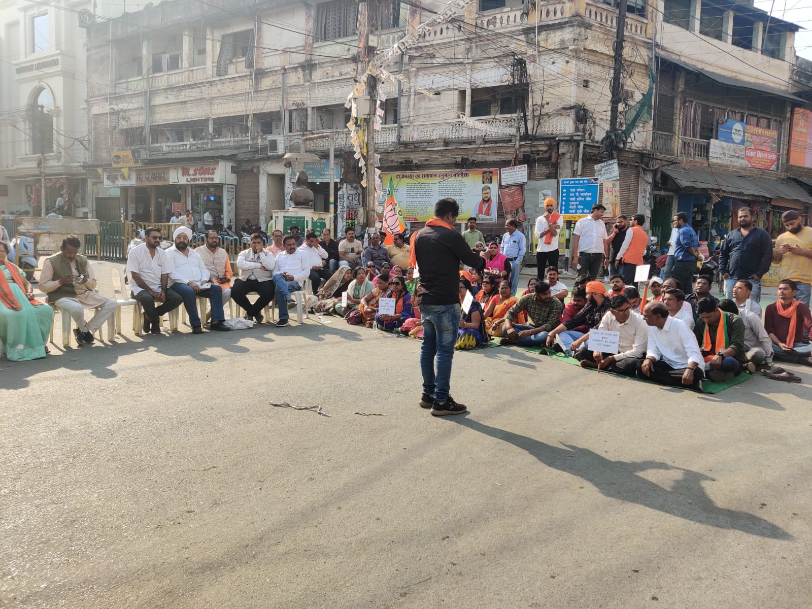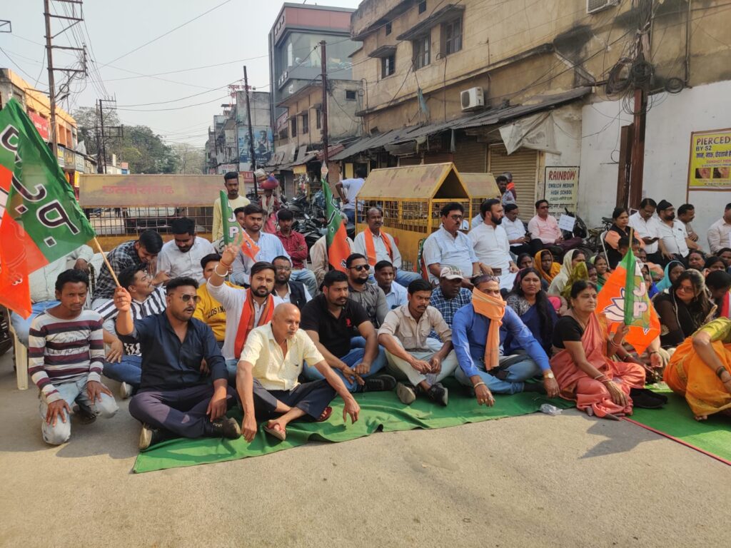दोपहर दो बजे स्थानीय भाजपा कार्यालय से जुलूस की शक्ल में नारेबाजी करते हुए भाजपा कार्यकर्ता सुभाष चौक पहुंचे और चौक को पूरी तरह घेर लिया। वे यहां दरी कुर्सी लगा कर बैठ गए । भाजपा नेताओं ने भूपेश बघेल और कांग्रेस सरकार पर नक्सलियों से मिलीभगत करके उनके कार्यकर्ताओ की हत्या करवाने का आरोप लगाते हुए कहा गया कि ऐसा करके सरकार भाजपा कार्यकर्ताओ को डराना चाहती है।