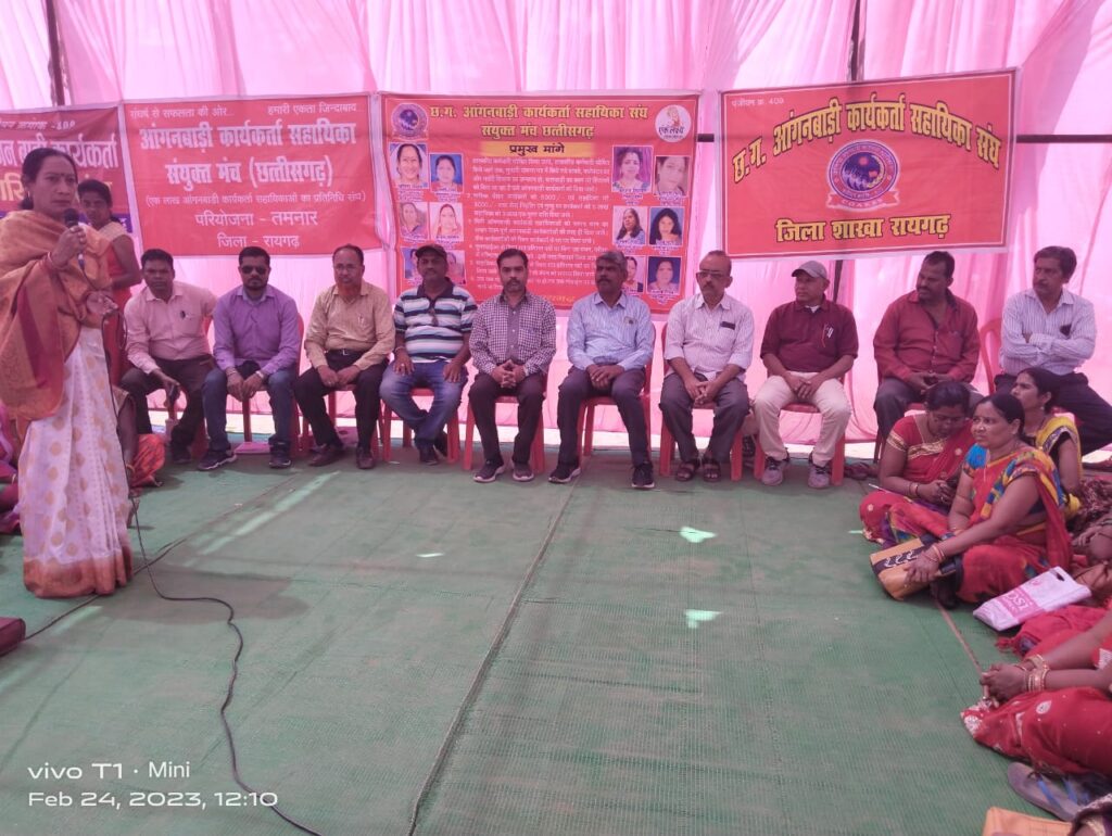 अध्यक्ष रवि गुप्ता कार्यकारी अध्यक्ष राजकुमार राज ग्रामीण बैंक रिटायर्ड एम्पलाइज एसोसिएशन के साथी अरुण कुमार मिश्रा साथी रवि कांत पांडे शामिल हुए । दांडी मार्च के पूर्व ट्रेड यूनियन काउंसिल के पदाधिकारियों द्वारा धरना स्थल पर नारेबाजी कर आंगनबाड़ी कार्यकर्ता एवं सहायिका का उत्साहवर्धन किया गया । सभा को संबोधित करते हुए ट्रेड यूनियन काउंसिल के उपाध्यक्ष शेख कलीमुल्लाह ने कहा कि चुनाव के समय घोषणा पत्र पर विश्वास कर मतदाता अपने मताधिकार का प्रयोग करता है प्रदेश के 1 लाख से अधिक आंगनबाड़ी कार्यकर्ता सहायिका ने जन घोषणा पर विश्वास करके भूपेश सरकार पर भरोसा जताया है इसलिए अब भूपेश सरकार को चाहिए कि वह पहली एवं अत्यंत जायज मांग आंगनबाड़ी कार्यकर्ता सहायिकाऔ को शासकीय कर्मचारी घोषित किया जावे। शासकीय कर्मचारी घोषित किए जाने तक सरकार द्वारा अपने जन घोषणा में घोषित नर्सरी शिक्षक पर उन्नयन और कलेक्टर दर पर वेतन तत्काल दिए जाने हेतु आदेश प्रसारित किया जावे साथ ही साथ अन्य पांच मांगों पर सरकार को अविलंब चर्चा कर मांगे पूरी करनी चाहिए। उन्होंने बताया कि अब तक दो बार ट्रेड यूनियन काउंसिल ने मुख्यमंत्री को पत्र भेजकर 6 सूत्री मांगों के निराकरण के लिए गुहार लगाई है लेकिन खेद का विषय है कि अभी तक मांगे पूरी नहीं की गई है और दांडी मार्च आज निकाली जा रही है। छत्तीसगढ़ आंगनबाड़ी कार्यकर्ता सहायिका संघ के अध्यक्ष श्रीमती अनीता नायक ने कहा कि हमारा संघर्ष सफलता की ओर जा रहा है आज राजधानी रायपुर में हमारे प्रांतीय पदाधिकारियों को सचिव छत्तीसगढ़ शासन ने चर्चा के लिए आमंत्रित किया है आप सब धैर्य रखें हम अपना जायज हक हासिल करके रहेंगे ।धरना स्थल मिनी स्टेडियम से अंबेडकर प्रतिमा स्थल तक छत्तीसगढ़ आंगनबाड़ी कार्यकर्ता सहायिका संघ के अध्यक्ष श्रीमती अनीता नायक के नेतृत्व में दांडी मार्च निकाला गया। दांडी मार्च मैं श्रीमती काजल विश्वास जिला सचिव, माधुरी गुप्ता ग्रामीण अध्यक्ष, लक्ष्मी यादव शहरी अध्यक्ष ,ललिता पुसौर ब्लॉक अध्यक्ष, कमला डनसेना ब्लॉक अध्यक्ष खरसिया रेवती गुप्ता तमनार ब्लाक अध्यक्ष होलिका यादव ब्लॉक अध्यक्ष बुकदेगा रेणुका सिंह धर्मजयगढ़ ब्लॉक अध्यक्ष ममता बुर्सेट घरघोड़ा ब्लॉक अध्यक्ष सलोनी लैलूंगा ब्लाक अध्यक्ष सहित जिले के सभी आंगनबाड़ी केंद्रों के आंगनबाड़ी कार्यकर्ता एवं सहायिका शामिल हुए। दांडी मार्च अंबेडकर प्रतिमा पहुंची तब वहां पर प्रतीकात्मक गांधी एवं अंबेडकर प्रतिमा पर माल्यार्पण किया गया और रघुपति राघव राजा राम का गायन करते हुए सत्याग्रह किया गया। दांडी यात्रा को सफल बनाने के लिए उपस्थित जनसमुदाय का छत्तीसगढ़ आंगनबाड़ी कार्यकर्ता सह