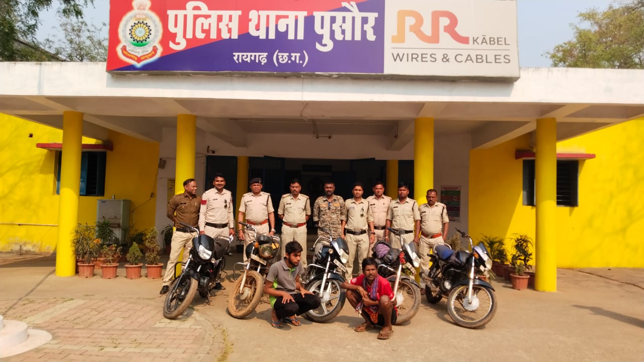 रायगढ़। वरिष्ठ पुलिस अधीक्षक श्री सदानंद कुमार के दिशा निर्देशन एवं एडिशनल एसपी श्री संजय महादेवा के मार्गदर्शन पर पुसौर थाना प्रभारी निरीक्षक नारायण सिंह मरकाम के नेतृत्व में आज पुसौर पुलिस द्वारा मुखबीर सूचना पर चोरी की पांच मोटरसाइकिल के साथ दो आरोपियों को गिरफ्तार किया गया है ।