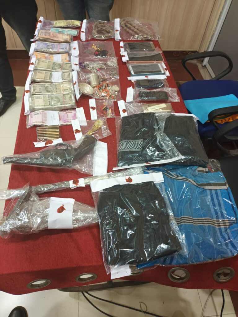 एक देशी कट्टा और 05 जिंदा कारतूत । नकद रकम ₹2,36,050 के साथ लगभग 1 तोला सोना और 3 तोला चांदी जुमला कीमती – 3,50,000 रूपये ।