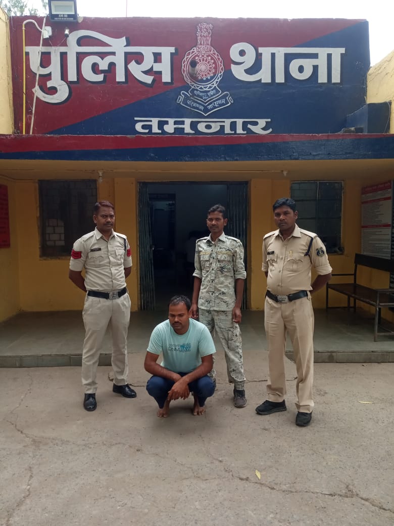 एसएसपी श्री सदानंद कुमार द्वारा गंभीर अपराधों के फरार आरोपी की थाना प्रभारियों द्वारा स्वत: जांच, पतासाजी के दिये निर्देशों पर थाना प्रभारी तमनार निरीक्षक प्रवीण मिंज द्वारा मुखबिर लगाकर फरार आरोपी की सरगर्मी से तलाश की जा रही थी । गत दिनों थाना प्रभारी को मुखबिर द्वारा आरोपी मुकेश पटेल के उसके रिश्तेदार के यहां ग्राम बैहामुड़ा, घरघोड़ा में छिपे होने की जानकारी देने पर तत्काल तमनार थाने से स्टाफ द्वारा ग्राम बैहामुड़ा में दबिश देकर *आरोपी मुकेश पटेल पिता शिवचरण पटेल उम्र 32 साल निवासी रायपारा समकेरा थाना तमनार* को हिरासत में लेकर थाना लाया गया जिसे कल रात्रि गिरफ्तार कर आज जेएमएफसी घरघोड़ा के न्यायालय न्यायिक रिमांड पर भेजा गया है आरोपी के विरुद्ध शीघ्र पूरक चालान पेश किया जावेगा । एडिशनल एसपी संजय महादवेा एवं एसडीओपी धरमजयगढ़ दीपक मिश्रा के उचित मार्गदर्शन पर फरार आरोपी पतासाजी, गिरफ्तारी में थाना प्रभारी तमनार निरीक्षक प्रवीण मिंज, प्रधान आरक्षक देव प्रसाद राठिया और आरक्षक भूपेश राठिया की अहम भूमिका रही है ।