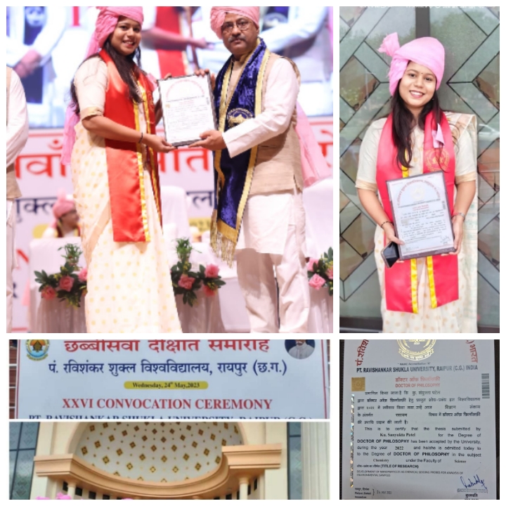 रायगढ़ । रायगढ़ कोतरा रोड निवासी अधिवक्ता बृजलाल पटेल और श्रीमती फुलकुमारी पटेल की सुपुत्री संयुक्ता पटेल को पं.रविशंकर शुक्ला विश्वविद्यालय द्वारा आयोजित छब्बीसवें दीक्षांत समारोह में पीएच.डी.की उपाधि प्रदान की गयी | उक्त कार्यक्रम में राज्यपाल विश्वभूषण हरीचंदन, मुख्यमंत्री भूपेश बघेल, पद्मश्री प्रोफेसर वाई. एस. राजन (इसरो) एवं कुलपति सच्चीदानंद शुक्ला उपस्थित थे | डॉ.संयुक्ता पटेल द्वारा प्रस्तुत शोध प्रबंध “डेवेलोपमेंट ऑफ नानोपार्टिकल एज केमिकल सेंसिंग प्रोब फॉर एनालीसिस ऑफ इन्वेर्न्मेंटल सेम्पल्स” के विषय संदर्भ में उपाधि दी गयी। उन्होंने अपना शोध कार्य निर्देशक डॉ. दीपक सिन्हा (शास.नागार्जुन स्न्नातकोतर विज्ञान महाविद्यालय रायपुर छ. ग.) एवं प्रो.कमलेश के.श्रीवास (पं.रविशंकर शुक्ल विश्वविद्यालय रायपुर (छ. ग.) के निर्देशन से पूर्ण किया । डॉ. संयुक्ता पटेल को डॉक्टरेट की उपाधि मिलने से अघरिया समाज ही नहीं पूरे रायगढ़ नगर में हर्ष व्याप्त है और उनके परिजन प्रियजन शुभचिंतकों ने संयुक्ता के साथ उनके पिता अधिवक्ता बृजलाल पटेल, माता फुलकुमारी पटेल और भईया दीपक पटेल सहित समस्त परिवार को बेटी की इस गौरवपूर्ण उपलब्धि के लिए विशेष रूप से बधाई दी है ।अखिल भारतीय अधरिया समाज के अध्यक्ष भुवनेश्वर पटेल, नगर अध्यक्ष लक्ष्मीकांत पटेल एवं समस्त केन्द्रीय पदाधिकारियों अधिवक्ता संगठन के सदस्यों , प्रवक्ता व्याख्याता भोजराम पटेल एवं समस्त पदाधिकारियों द्वारा संयुक्ता पटेल को डॉक्टरेट की उपाधि मिलने पर हर्ष व्यक्त करते हुए उसे बधाई दी गई है तथा उसके उज्जवल भविष्य की हार्दिक शुभकामना भी प्रदान की गई है ।