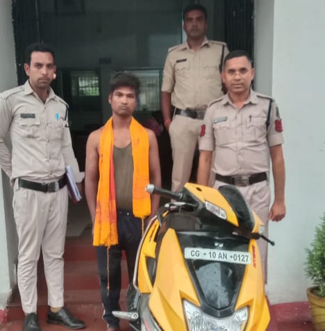चोरी नैस्ट्रो स्कूटी CG 10 AN 0127 के संबंध में कल 3 जून को थाना कोतवाली रायगढ़ में नगर पंचायत बाराद्वारा वार्ड क्रमांक 02 बाजार पारा जिला सक्ती में रहने वाले तुषार यादव ने बताया कि 02 जून को अपने परिचित की नैस्ट्रो स्कूटी मांग कर सक्ती से रायगढ़ राष्ट्रीय रामायण महोत्सव देखने आया था, रात्रि में स्कूटी गांधी गंज खड़ी कर रेलवे स्टेशन की ओर गया और आधा घंटा बाद वापस आकर देखा तो स्कूटी को कोई चोरी कर ले गया था । चोरी की रिपोर्ट पर कोतवाली पुलिस अज्ञात आरोपी पर *धारा 379 आईपीसी* के तहत अपराध पंजीबद्ध कर माल मुलजिम पतासाजी किया जा रहा था कि आज दोपहर नगर कोतवाल शनिप रात्रे को उनके सक्रिय मुखबिर से संदेही वाहन चोर का सूचना मिला और कोतवाली स्टाफ को वाहन चोर को पकड़ने में सफलता मिली । चोरी गई *नैस्ट्रो स्कूटी CG 10 AN- 0127 कीमत ₹40,000 की शीघ्र बरामदगी और आरोपी की गिरफ्तारी* में थाना प्रभारी कोतवाली निरीक्षक शनिप रात्रे, प्रधान आरक्षक विक्रम चौरसिया, दिलीप भानु, आरक्षक जगन्नाथ साहू एवं गणेश पैकरा की अहम भूमिका रही है ।