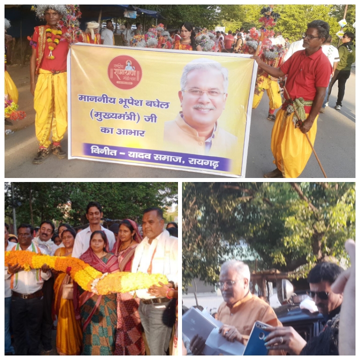 रायगढ़ / रायगढ़ शहर में राष्ट्रीय रामायण महोत्सव का 3 दिवसीय कार्यक्रम चला, जिसमें समापन के दिन 3/5/2023 शनिवार को समापन के लिए छत्तीसगढ़ के यशस्वी मुख्यमंत्री श्री भूपेश बघेल जी का आगमन हुआ मुख्यमंत्री श्री भूपेश बघेल जी के द्वारा यादव समाज रायगढ़ के लिए बीस लाख की स्वीकृति कि घोषणा किया गया था। जिस पर यादव समाज के द्वारा सर्किट हाउस चौक पर मुख्यमंत्री जी का बाजे गाजे, ढोल नगाड़ों के साथ व विशाल में माला के द्वारा के सैकड़ों संख्या में उनका भव्य स्वागत व अभिनंदन किया ऐसा अभिनंदन व स्वागत पर श्री शाखा यादव, एस डी यादव ,जतिराम यादव ,बी पी गोपाल ,गणेश यादव ,विकास ठेठवार , लकी राम यादव,संतोष यादव ,आशीष यादव, गोपाल यादव दिनेश यादव, मुनु यादव ,सागर यादव ,कमलेश यादव, चमेली यादव, संगीता यादव गीता यादव, नेहा यादव , सरोजनी यादव ,आदि समस्त गणमान्य लोग उपस्थित थे।