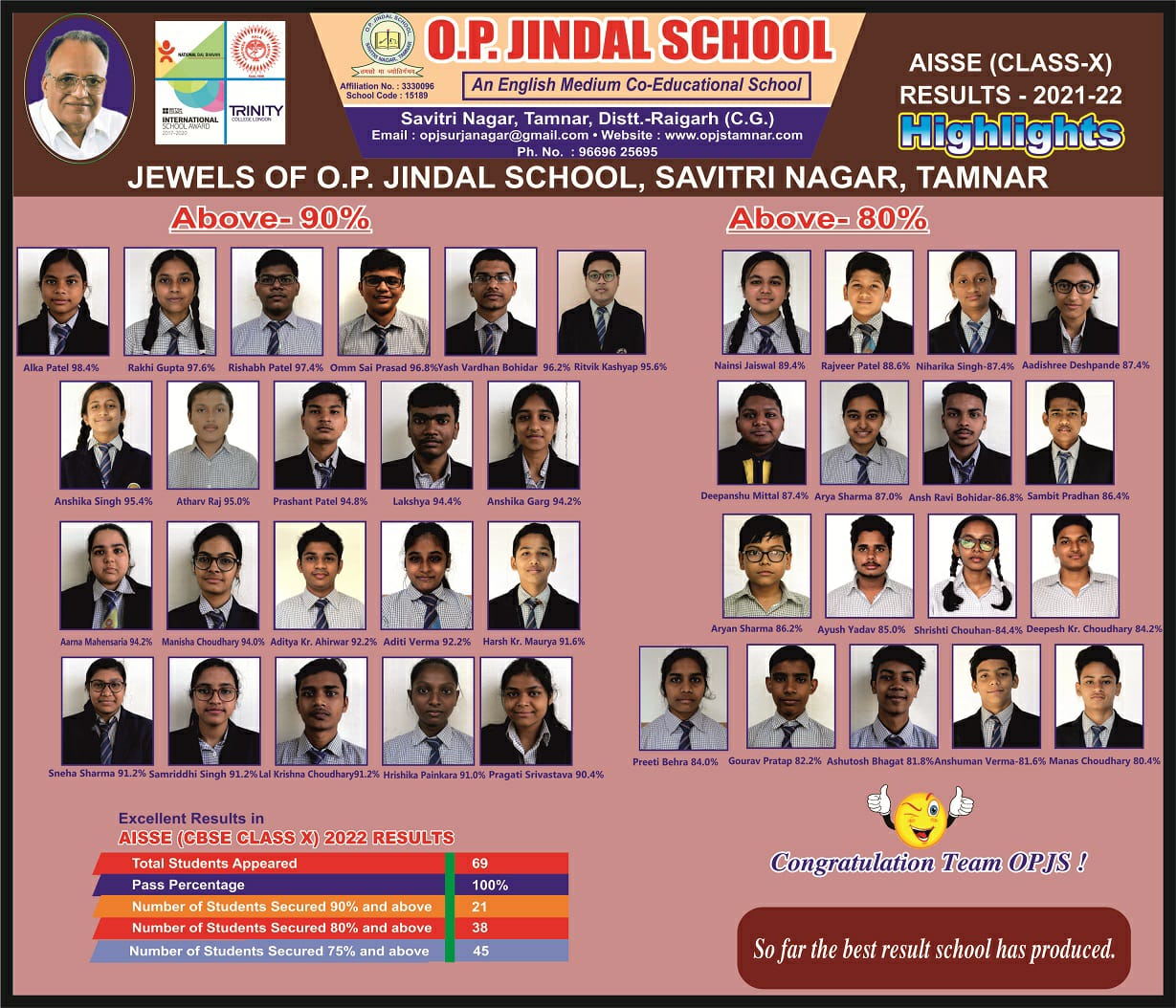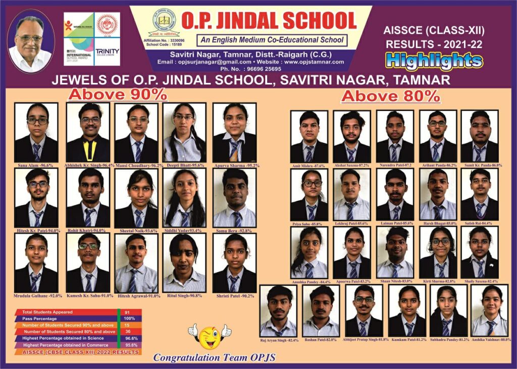 आईटी 99 ,राखी गुप्ता रही। ज्ञात रहे कि ओपी जिंदल स्कूल सावित्री नगर तमनार विगत वर्षों से बोर्ड परीक्षा में श्रेष्ठ परिणामों के लिए उल्लेखनीय रहा तथा पूरे प्रदेश में अपनी अलग पहचान बनाए विद्यालय अपने गरिमा मय अनुशासन एवं उच्च कोटि के
