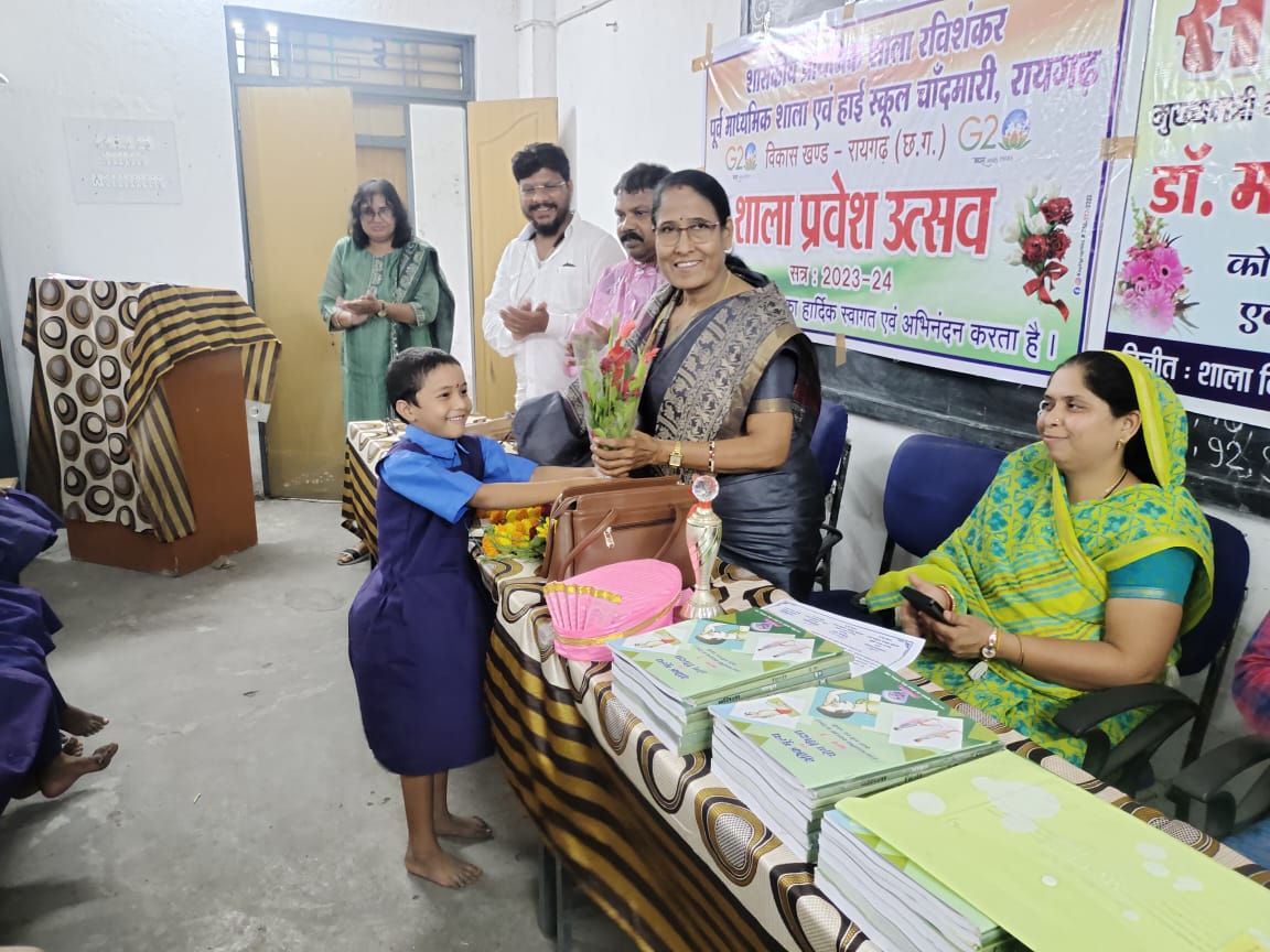 रायगढ़ / शासकीय रविशंकर प्राथमिक शाला में शाला प्रवेशोत्सव में विधायक प्रतिनिधि शिक्षा विभाग शेख ताजीम,वार्ड पार्षद श्रीमती रंजना कमल पटेल,जिलाध्यक्ष कॉंग्रेस अल्पसंख्यकविभाग हाजी मुबशिर हुसैन विद्यालय प्रबंधन समिति के अध्यक्ष श्याम लाल सारथी व सम्मानित सदस्य,पिंटू शर्मा अभिभावकगण,गणमान्य नागरिक,संकुल प्रभारी श्रीमती अर्चना स्वर्णकार ,शालेय स्टाफ व कर्मचारीगण की गरिमामय उपस्थिति में कार्यक्रम का शुभारंभ विद्या की अधिष्ठात्री देवी मां सरस्वती एवं छत्तीसगढ़ महतारी की प्रतिमा के समक्ष दीप प्रज्जवलन कर किया गया।मंचासीन अतिथियों ने अपने उद्बोधन में शाला के सुचारू रूप से संचालन हेतु, बच्चों को शाला में प्रवेश, ठहराव, शत् प्रतिशत उपस्थिति के साथ -साथ उनके समग्र सर्वांगीण विकास व शैक्षिक गुणवत्ता पर बल देने की बात कही व शासन की महत्वाकांक्षी योजनाओं का सफल क्रियान्वयन हेतु विचार व्यक्त किए। इस अवसर पर नशा-मुक्ति हेतु शपथ लिया गया। नवप्रवेशी बच्चों को तिलक,रोली लगाकर,माला,पगड़ी पहनाकर,पाठ्य पुस्तक,गणवेश,स्लेट,अभ्यास पुस्तिका, चाकलेट जनप्रतिनिधियों व आमंत्रित अतिथियों के माध्यम से वितरित कर उनके उज्जवल भविष्य हेतु शुभाशीष प्रदान किए। बच्चों में उत्साह व उमंग दृष्टिगोचर हो रही थी। विद्यालय प्रबंधन समिति व शालेय परिवार की द्वारा डॉ.मनीषा त्रिपाठी प्रधान पाठक शासकीय रविशंकर प्राथमिक शाला रायगढ़ को शिक्षा के क्षेत्र में उत्कृष्ट कार्य हेतु मुख्यमंत्री गौरव अलंकरण शिक्षादूत पुरस्कार से सम्मानित होने पर उन्हें शाला में अनुकरणीय कार्यों के लिए बुके, प्रशस्ति पत्र, मोमेंटो,शाल व उपहार देकर सम्मानित किया गया। उपस्थित समस्त आमंत्रित अतिथियों ने कार्यक्रम की भूरि -भूरि प्रशंसा की। कार्यक्रम का मंच संचालन डॉ.मनीषा त्रिपाठी ने किया व आभार प्रदर्शन वरिष्ठ शिक्षिका श्रीमती सरोज बाला मिश्रा ने किया। कार्यक्रम को सफल बनाने में शालेय परिवार की सहभागिता रही।