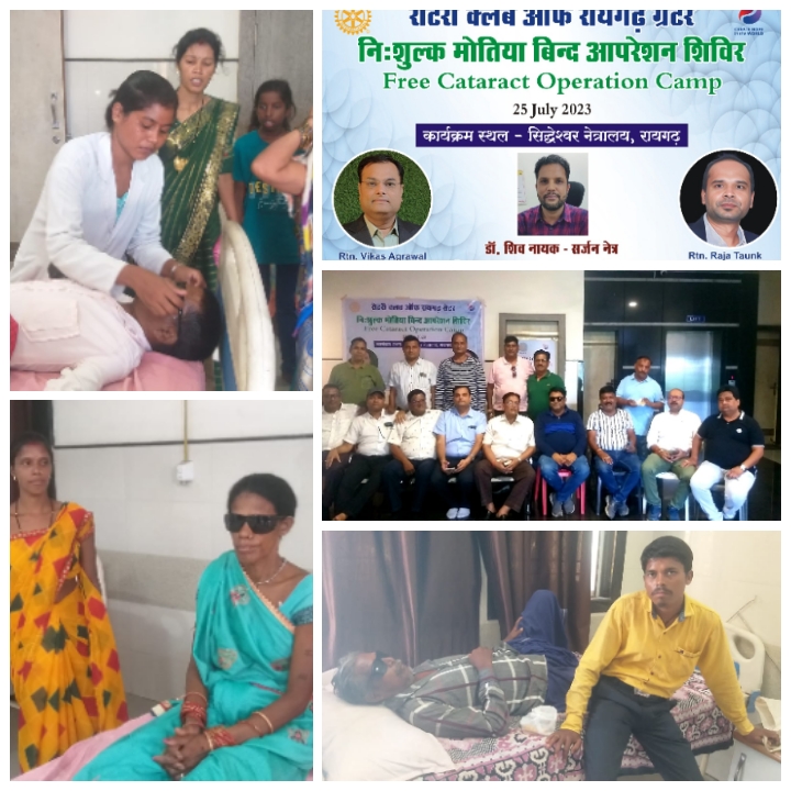रायगढ़ / समाज सेवा के क्षेत्र में सदैव समर्पित अंतरराष्ट्रीय संस्था रोटरी ग्रेटर क्लब अॉफ रायगढ़ ने एक बार पुनः मानवीय संवेदना का परिचय देते नवीन क्लब अध्यक्ष विकास अग्रवाल के विशेष मार्गदर्शन में आज नव कार्यकाल का पहला कार्यक्रम के अन्तर्गत स्वास्थ्य सेवा को प्रमुखता देते हुए। शहर के सुप्रसिद्ध सिद्धेश्वर नेत्र चिकित्साशास्त्र में दोपहर 12 बजे समाज के जरुरतमंद लोगों के लिए निःशुल्क मोतियाबिंद आपरेशन का आयोजन नेत्र रोग विशेषज्ञ डॉ शिव नायक के सानिध्य में किया। वहीं आपरेशन के पश्चात सभी लोगों को रोटरी ग्रेटर क्लब ने निःशुल्क दवाईयां भी दी।
