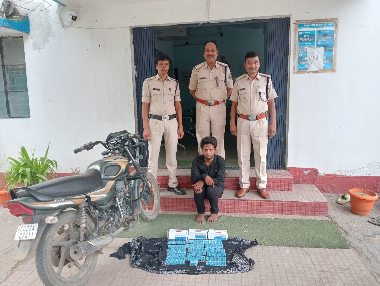 वहीं थाना प्रभारी घरघोड़ा निरीक्षक शरद चंद्रा द्वारा क्षेत्र में नशीली दवाओं की बिक्री पर कार्यवाही के लिए एडिशनल एसपी श्री संजय महादेवा एवं एसडीओपी धरमजयगढ़ श्री दीपक मिश्रा के मार्गदर्शन पर मुखबिर सक्रिय कर सूचनाएं ली जा ही है । इसी क्रम में कल रात्रि थाना प्रभारी घरघोड़ा को मुखबिर ने मोटर सायकल बजाज सीटी 100 में एक युवक के बहिरकेला रोड़ की ओर से नशीली टेबलेट लेकर नवागढ की ओर बिक्री करने ले जाने की सूचना दिया जिसकी तस्दीकी एवं कार्यवाही के लिये थाना प्रभारी ने मुख्य मार्ग के अतिरिक्त अंदरूनी रास्तों पर संदेही मोटर सायकल चालक पर निगाह रखने स्टाफ तैनात किया गया । पुलिस टीम द्वारा *ग्राम नवागढ हनुमान मंदिर के पास मेन रोड* में नाकाबंदी कर मुखबीर के बताये अनुसार बजाज सीटी 100 रंग गोल्डन काई रंग मोटर सायकल क्रमांक सीजी 29 एसी 7411 में सवार युवक को पकड़े । युवक ने अपना नाम *विकास महंत पिता बाबू लाल महंत उम्र 21 वर्ष सा. नवागढ थाना घरघोडा जिला रायगढ़* बताया जिसके पास SxxxxMO PxxxxxxON PLUS 385 MG ट्रेबलेट काफी मात्रा में मिला जिसके संबंध में संदेही युवक को संतोषप्रद जवाब नहीं दे पाया । आरोपी विकास महंत द्वारा प्रतिबंधित टेबलेट की अवैध बिक्री के पर्याप्त साक्ष्य मिलने पर आरोपी के कब्जे से *कुल 448 नग टेबलेट एवं मोटर सायकल बजाज सीटी 100 क्रमांक सीजी 29 एसी 7411* जप्त कर थाना घरघोड़ा में 22 (B) NDPS Act की कार्रवाई कर रिमांड पर भेजा गया है । सम्पूर्ण कार्यवाही में थाना प्रभारी घरघोड़ा निरीक्षक शरद चंद्रा, उप निरीक्षक करमू साय पैंकरा, प्रधान आरक्षक राजेश उरांव, आरक्षक उद्यो पटेल, भानू चन्द्रा, प्रहलाद भगत की अहम भूमिका रही है ।