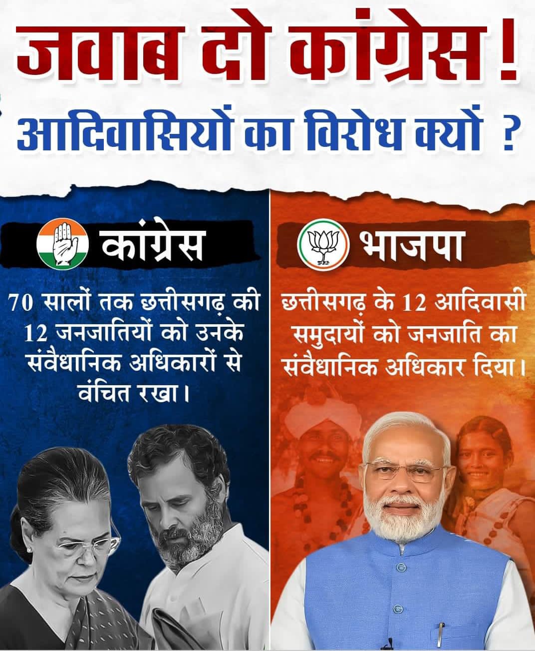 रायगढ़:- लिपिकीय त्रुटि की वजह से 12 जनजातियों से जुड़े आदिवासियो को उनके मूल अधिकार से दशकों से वंचित रखने के लिए प्रदेश भाजपा महामंत्री ओपी चौधरी ने कांग्रेस से जवाब मांगा है। उन्होंने कहा भूपेश बघेल मणिपुर मामले में प्रधान मंत्री को संसद में बयान देने की सलाह देते है लेकिन इस मुद्दे पर वे मौन क्यों है ? सत्ता की मलाई खाने में व्यस्त रही कांग्रेस की दशकों तक केंद्र व राज्यो में सरकार रही लेकिन उन्होंने इस लिपिकीय त्रुटि को सुधारने की कोई पहल नही की। इस त्रुटि की वजह से आदिवासी वोट डालने के अधिकार से वंचित रहे साथ ही आदिवासियो को मिलने वाली सुविधाओं से वंचित रहे। आदिवासी हितैषी श्रेय लेने वाली कांग्रेस को ‘लज्जा’ आनी चाहिये।आखिर कांग्रेस को 12 जनजातियों के हितों का ध्यान क्यो नही आया? इसका जवाब कांग्रेस को देना चाहिए। सत्ता आने के बाद कांग्रेस राज करने की मानसिकता से नही उबर पाती और भाजपा की मोदी सरकार सत्ता मिलने पर सही मायने में काज करती है। लिपिकीय त्रुटि को सुधार कर 12 जनजातियों को अधिकार दिलाने मोदी सरकार ने सर्वोत्तम काज की मिशाल पेश की है।