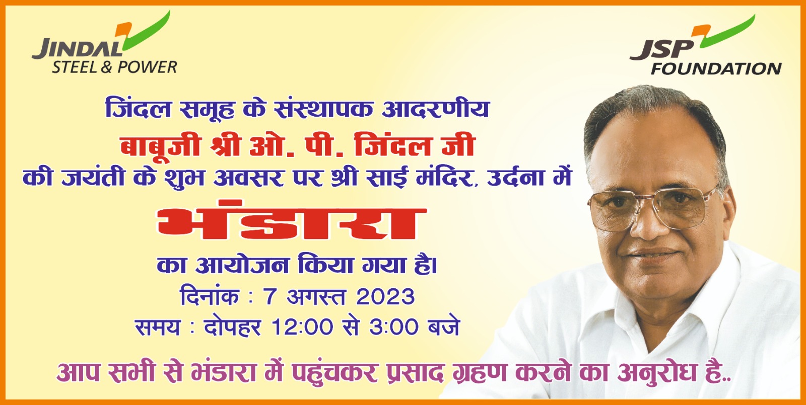 जिंदल समूह के संस्थापक आदरणीय बाबूजी श्री ओ.पी. जिंदल जी की जयंती के शुभ अवसर पर दिनांक 7 अगस्त, दिन सोमवार को जिंदल स्टील एंड पॉवर के रायगढ़ संयंत्र द्वारा विभिन्न कार्यक्रमों का आयोजन किया गया है।
