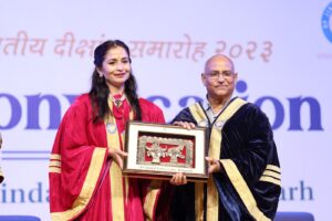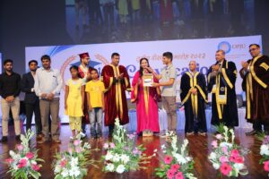 उपलब्धियों के बारे में बताया और साथ ही साथ वर्ष 2022-23 में प्राप्त उपलब्धियों को भी बताया। अपने प्रतिवेदन में डॉ पाटीदार ने बहुत कम समय में विश्वविद्यालय को प्राप्त हुए सम्मानों की जानकारी साझा करते हुए कहा की ओपी जिंदल विश्वविद्यालय, चांसलर श्रीमती शालू जिंदल जी के नेतृत्व एवं मार्गदर्शन में संरक्षक श्री नवीन जिंदल जी के सपनों को पूरा करने एवं विश्व स्तरीय शिक्षा प्रदान करने के लिए कटिबद्ध है और शीघ्र ही विश्व स्तर पर अपनी पहचान स्थापित करेगा। दीक्षांत समारोह के मुख्य
