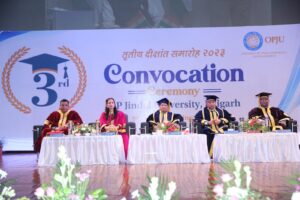 रायगढ़, / ओपी जिंदल विश्वविद्यालय, रायगढ़ के तीसरे दीक्षांत समारोह का भव्य आयोजन 9 अगस्त 2023 को संपन्न हुआ। ओपी जिंदल स्कूल, रायगढ़ के सभागार में आयोजित इस दीक्षांत समारोह के मुख्य अतिथि छत्तीसगढ़ के माननीय राज्यपाल श्री बिस्वभूषण हरिचंदन जी वर्चुअल माध्यम से जुड़े और विशिष्ट अतिथियों के रूप में डॉ उमेश कुमार मिश्र (अध्यक्ष- छत्तीसगढ़ निजी विश्वविद्यालय विनियामक आयोग, रायपुर), श्रीमती शालू जिंदल (चांसलर- ओपी जिंदल विश्वविद्यालय, रायगढ़) तथा श्री सब्यसाची बंद्योपाध्याय (एक्जीक्यूटिव डायरेक्टर -जिंदल स्टील एन्ड पावर, रायगढ़ रहे। इस तृतीय दीक्षांत समारोह के दौरान स्कूल ऑफ़ इंजीनियरिंग, स्कूल ऑफ़ मैनजेमेंट तथा स्कूल ऑफ़ साइंस के कुल 522 विद्यार्थियों को उपाधियाँ और साथ ही साथ 22 स्वर्ण, 24 रजत एवं 22 कांस्य पदक प्रदान किये गए।